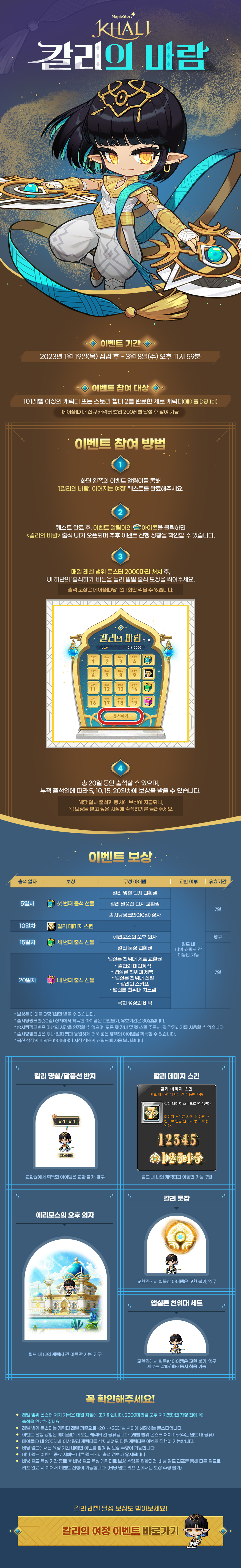 4. 총 20일 동안 출석할 수 있으며, 누적 출석일에 따라 5, 10, 15, 20일차에 보상을 받을 수 있습니다.